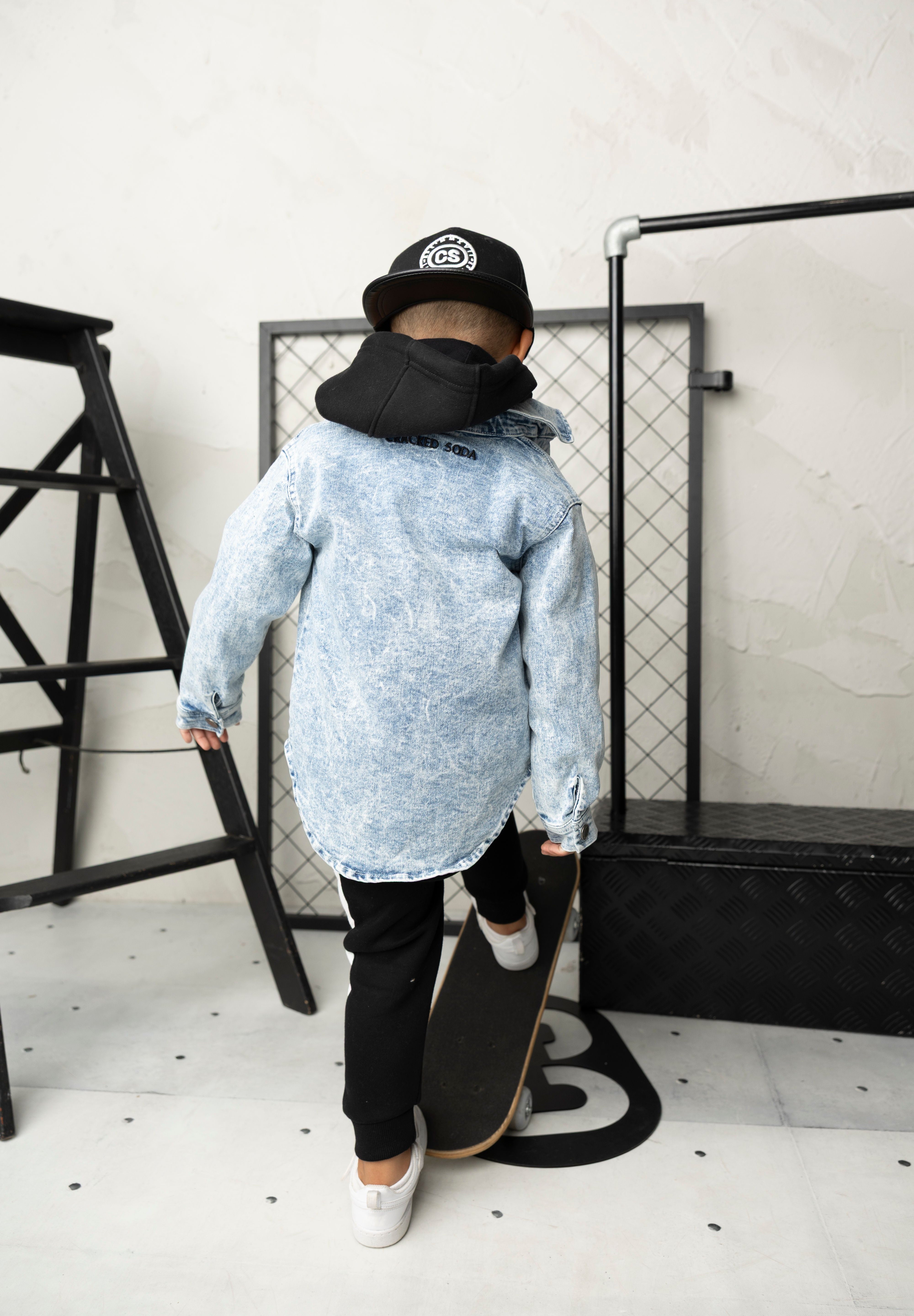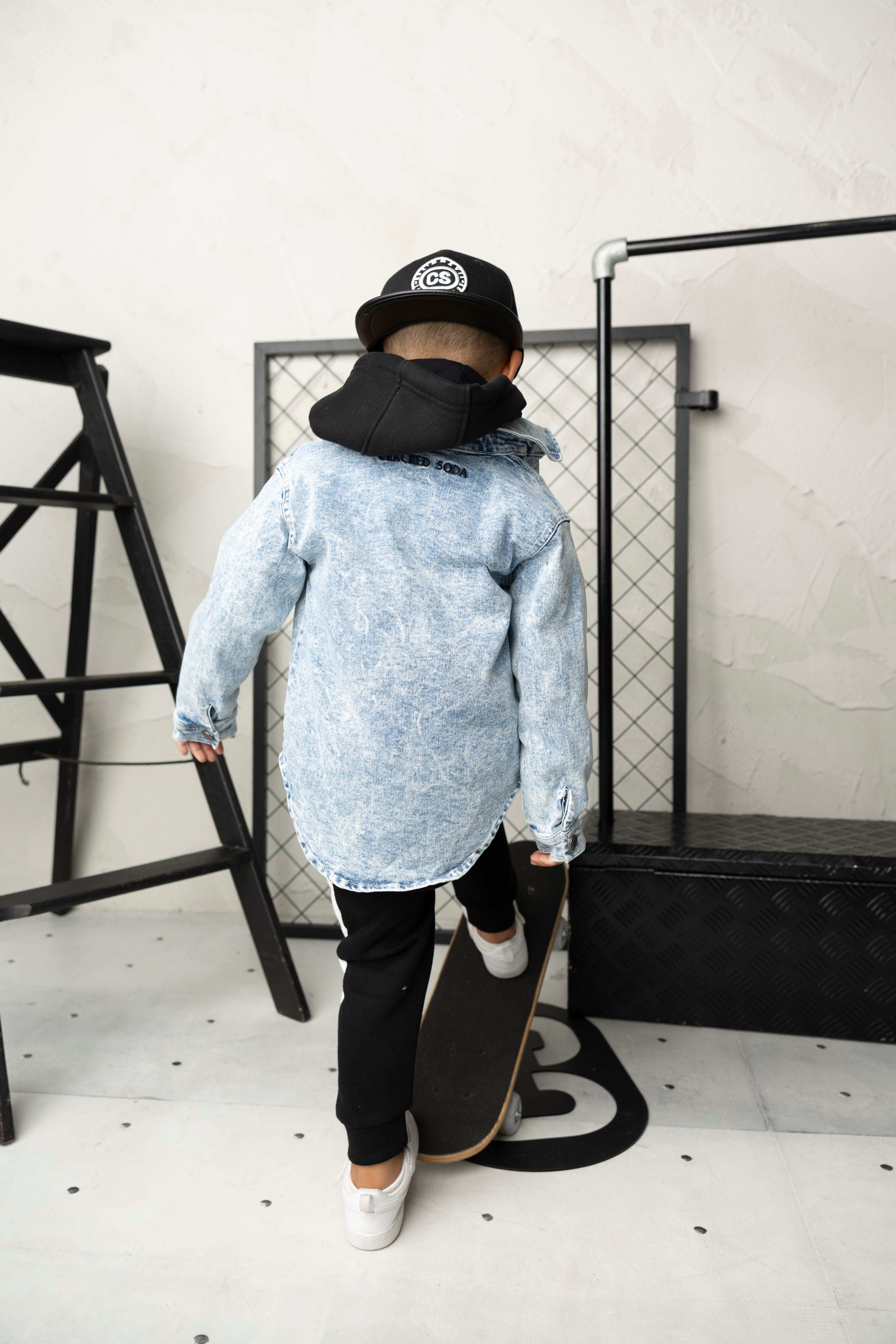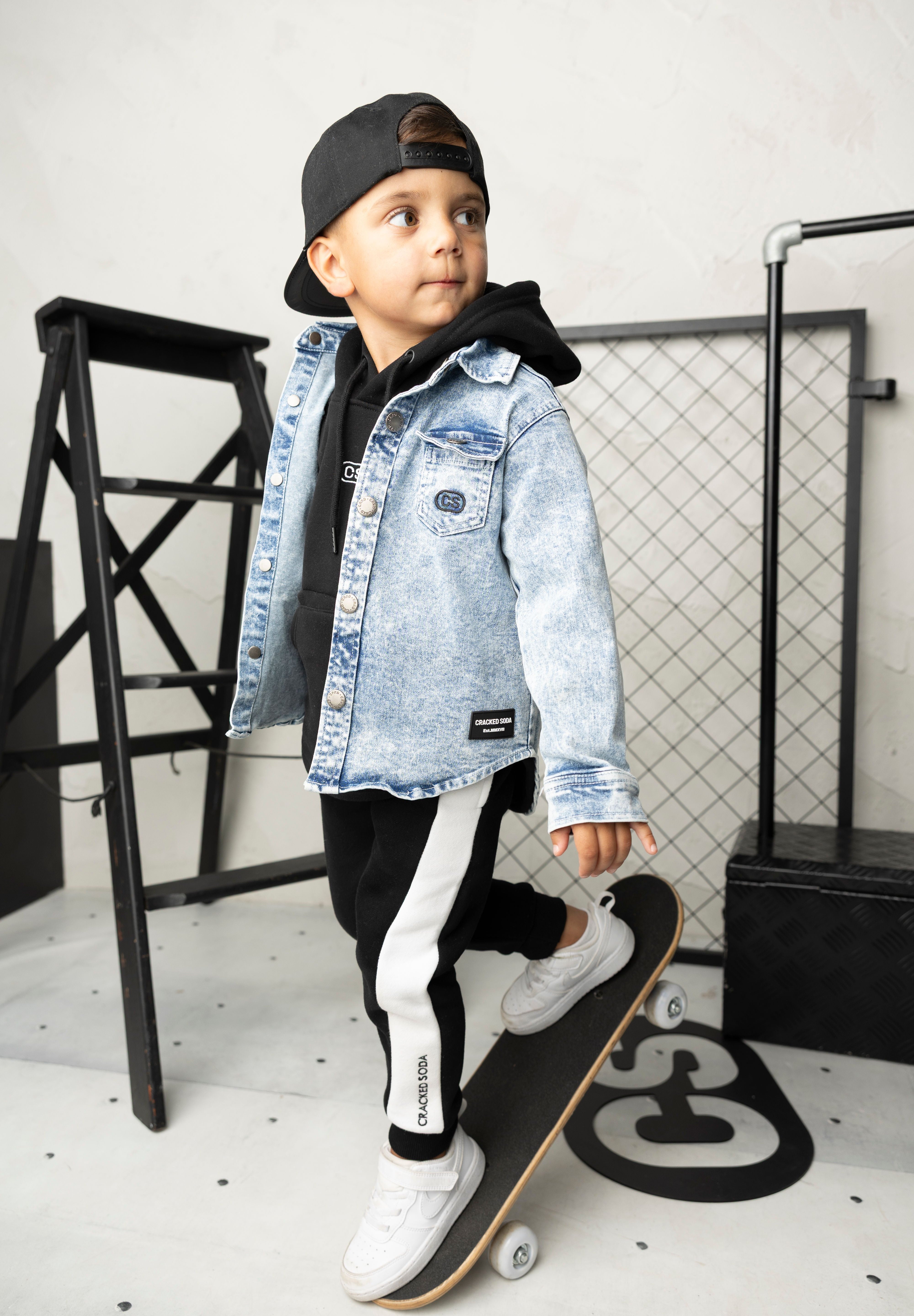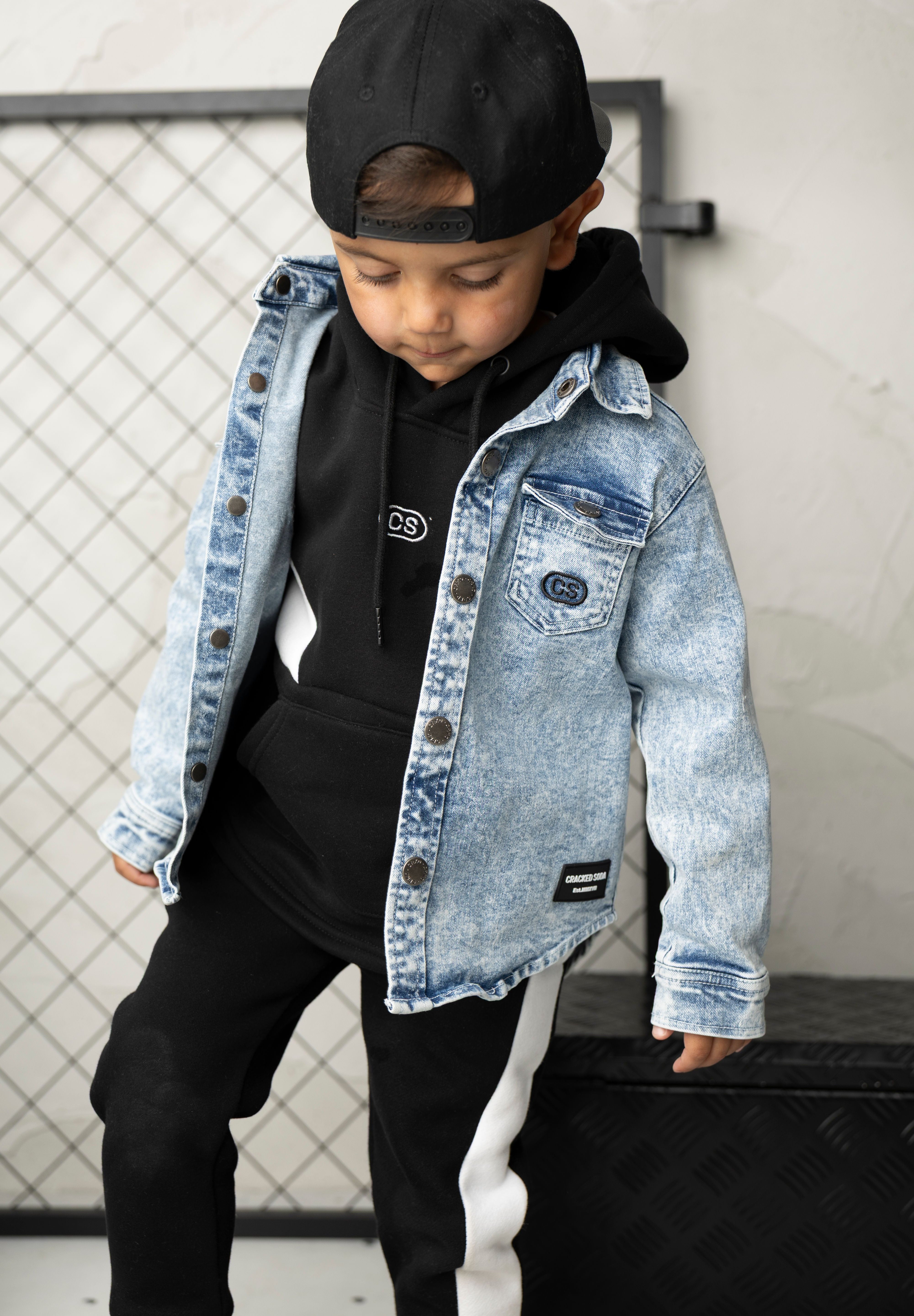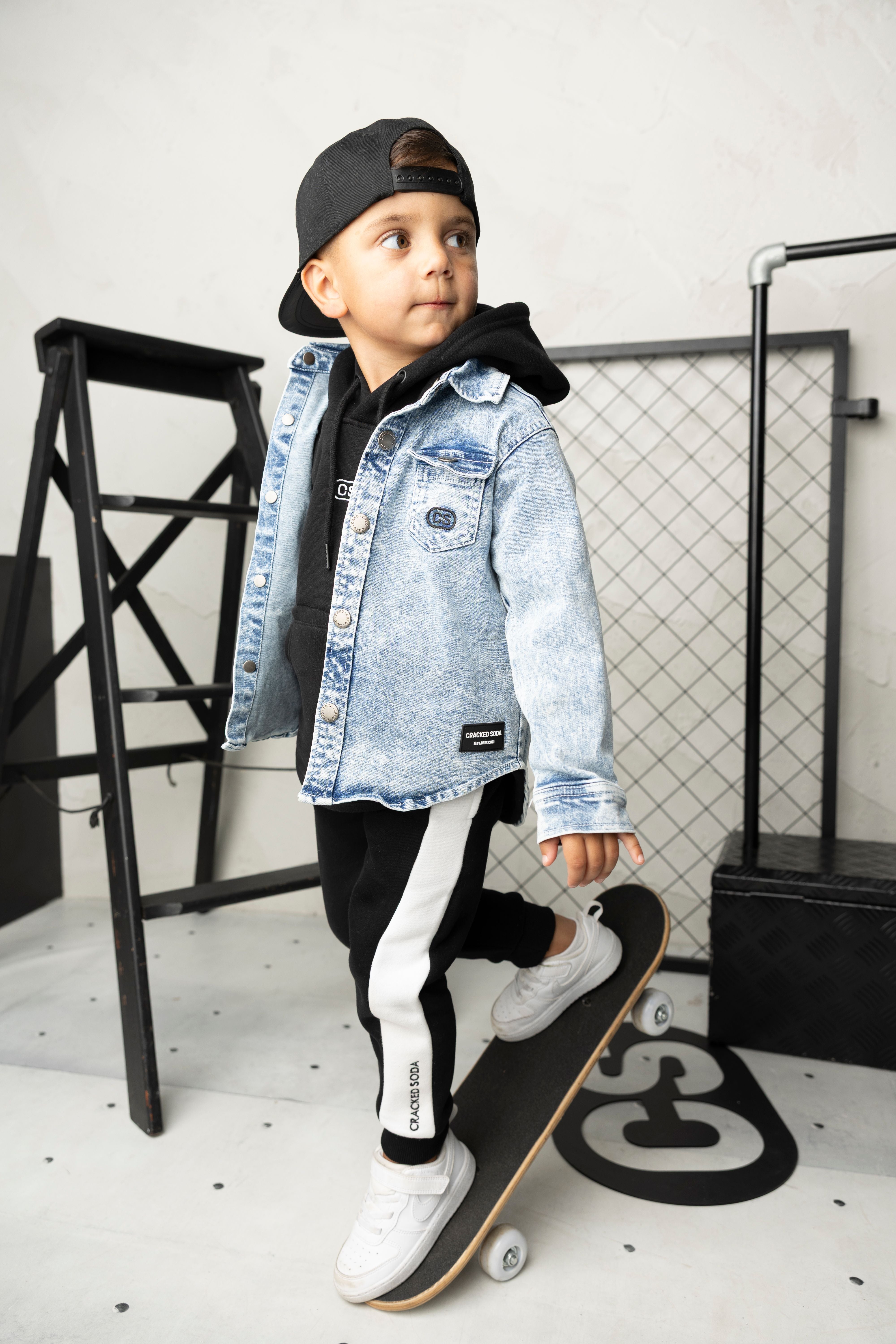 Get the complete Cracked Soda look with this three-piece set. The Zayn hoodie in black and white features a drawstring hood and embroidered CS logo for instant crew credibility. Layer it with the Henry trackpant—bold black with a white side panel and elastic waistband for a custom fit that moves with you. Top it off with the JJ denim jacket in classic blue, complete with snap buttons and signature CS pocket detail. Three essential pieces that work together or separately, delivering comfort and style for every moment of your day.