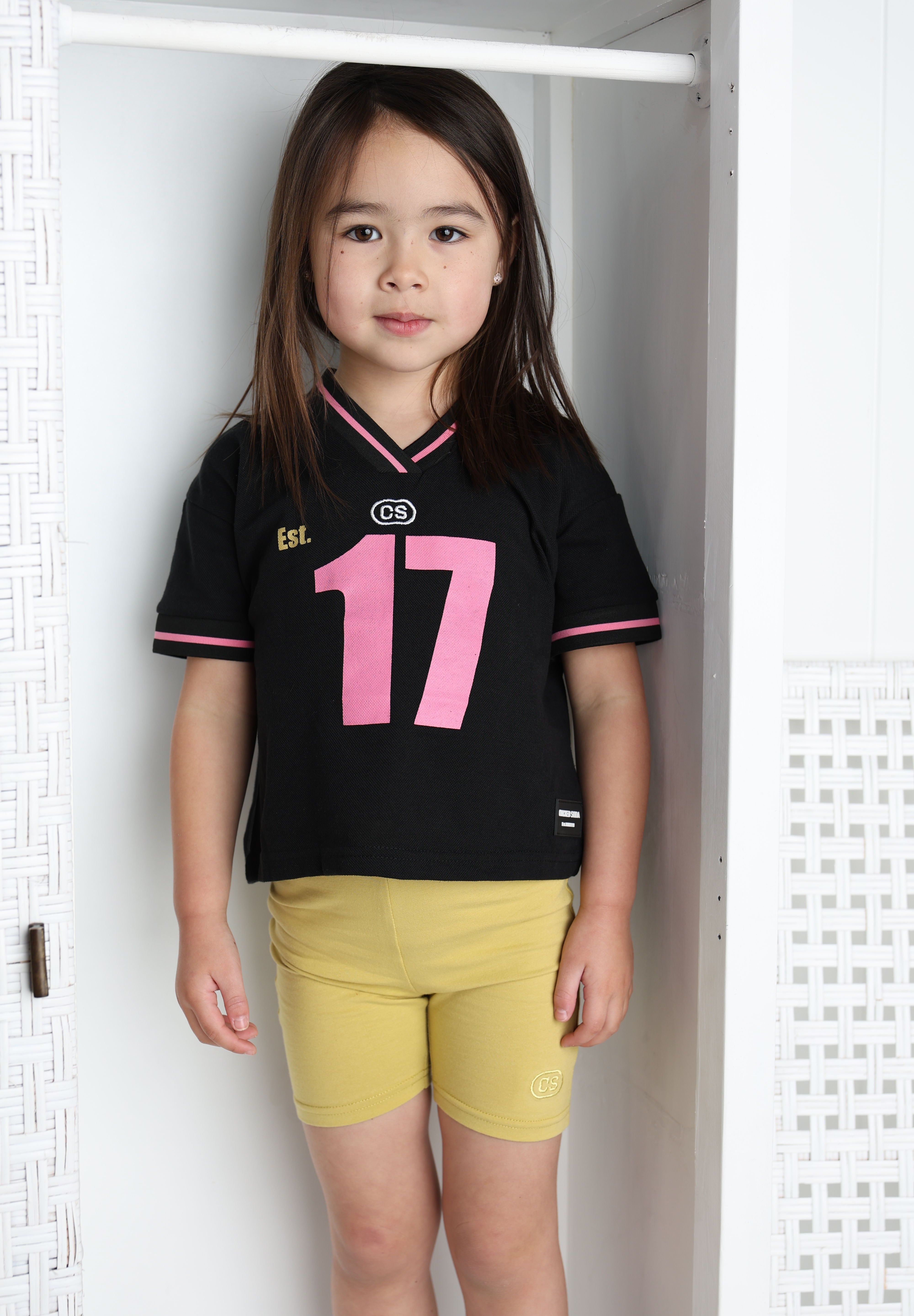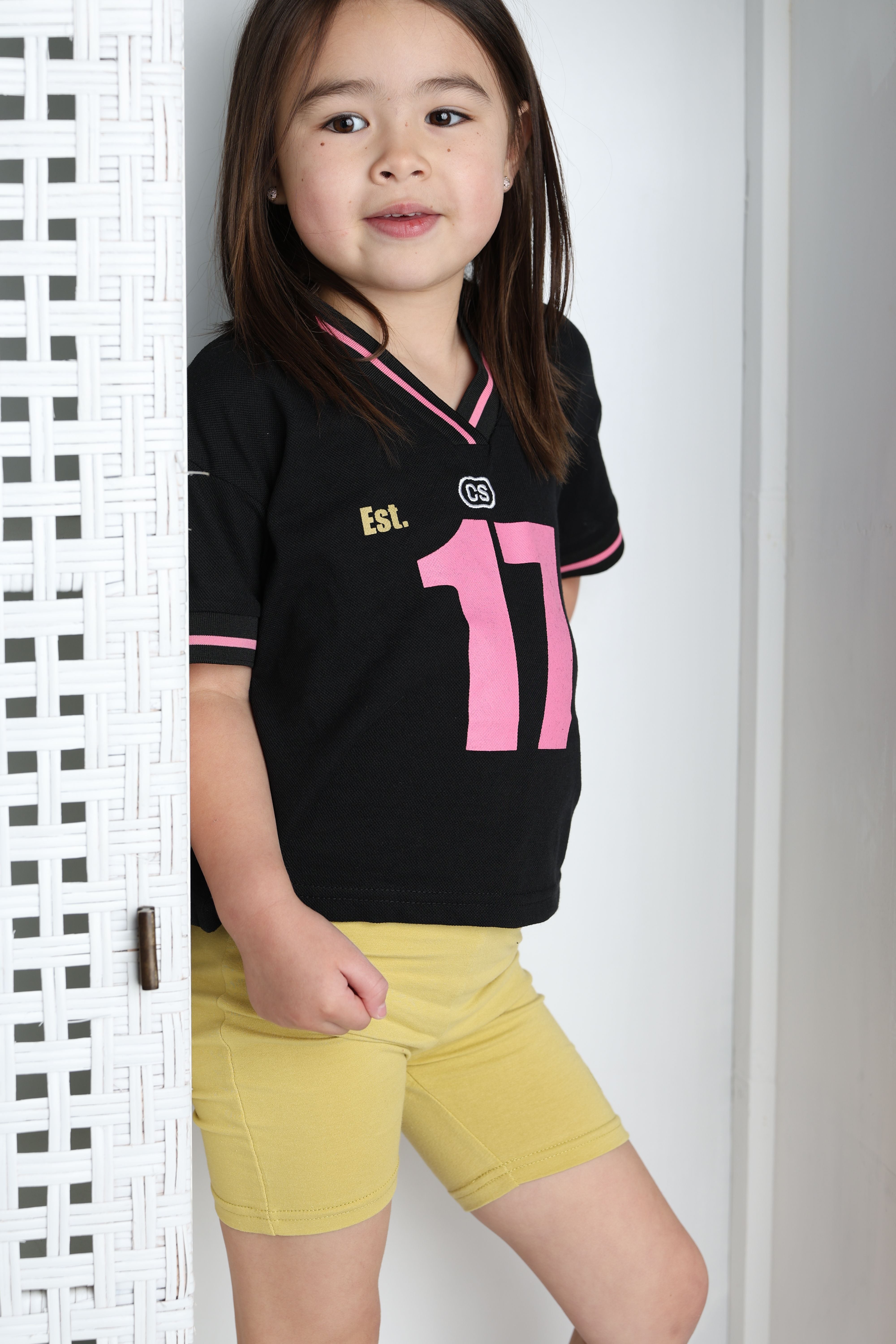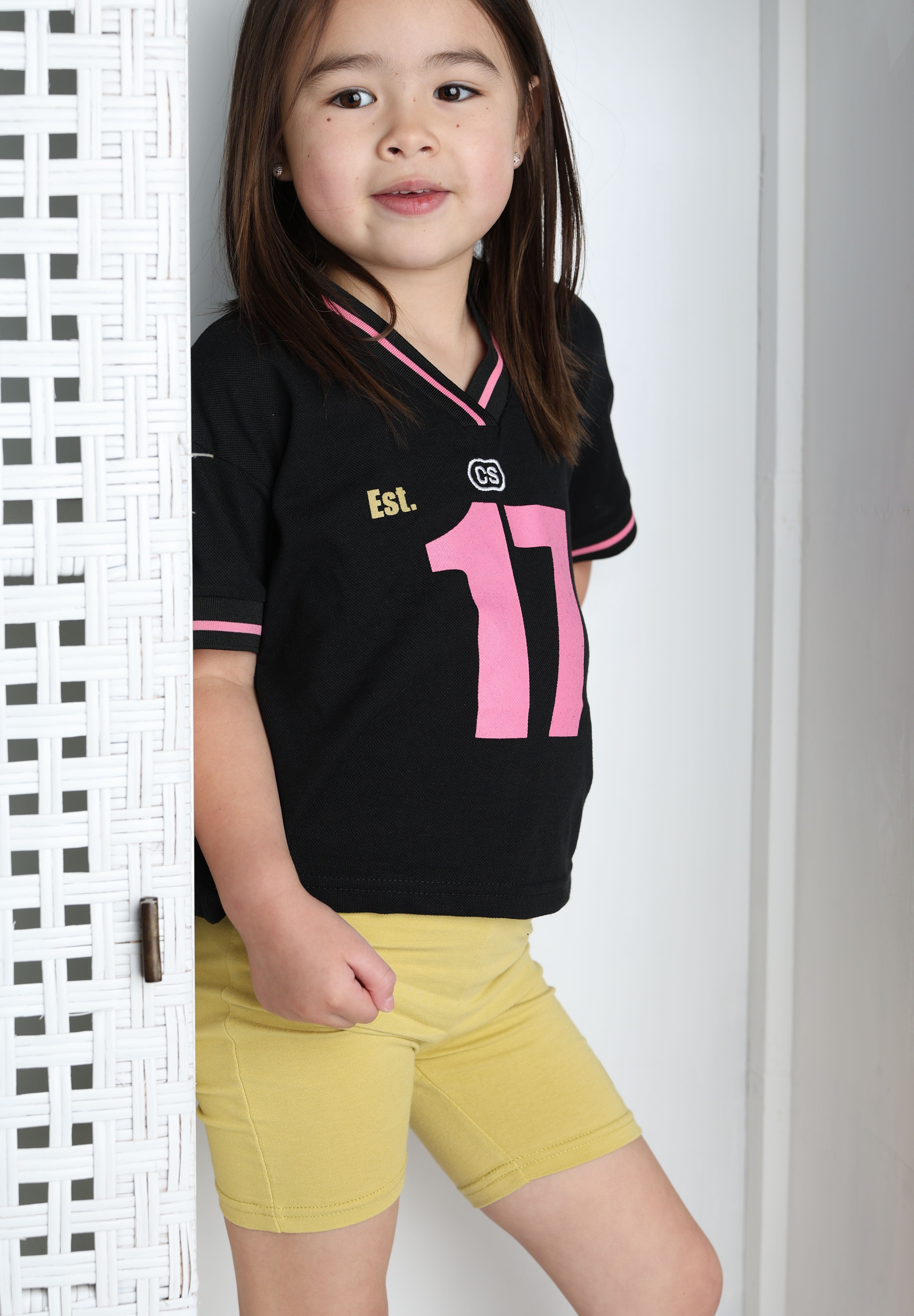 Built for active girls who want style and performance in one. This sport-inspired jersey tee features breathable fabric designed to keep up with her on the field, court, or playground. The sleek black base with pink and white detailing gives it an athletic edge while staying versatile enough for casual wear. Durable construction means it'll withstand countless washes and adventures. The perfect blend of sporty comfort and everyday cool.