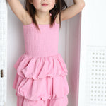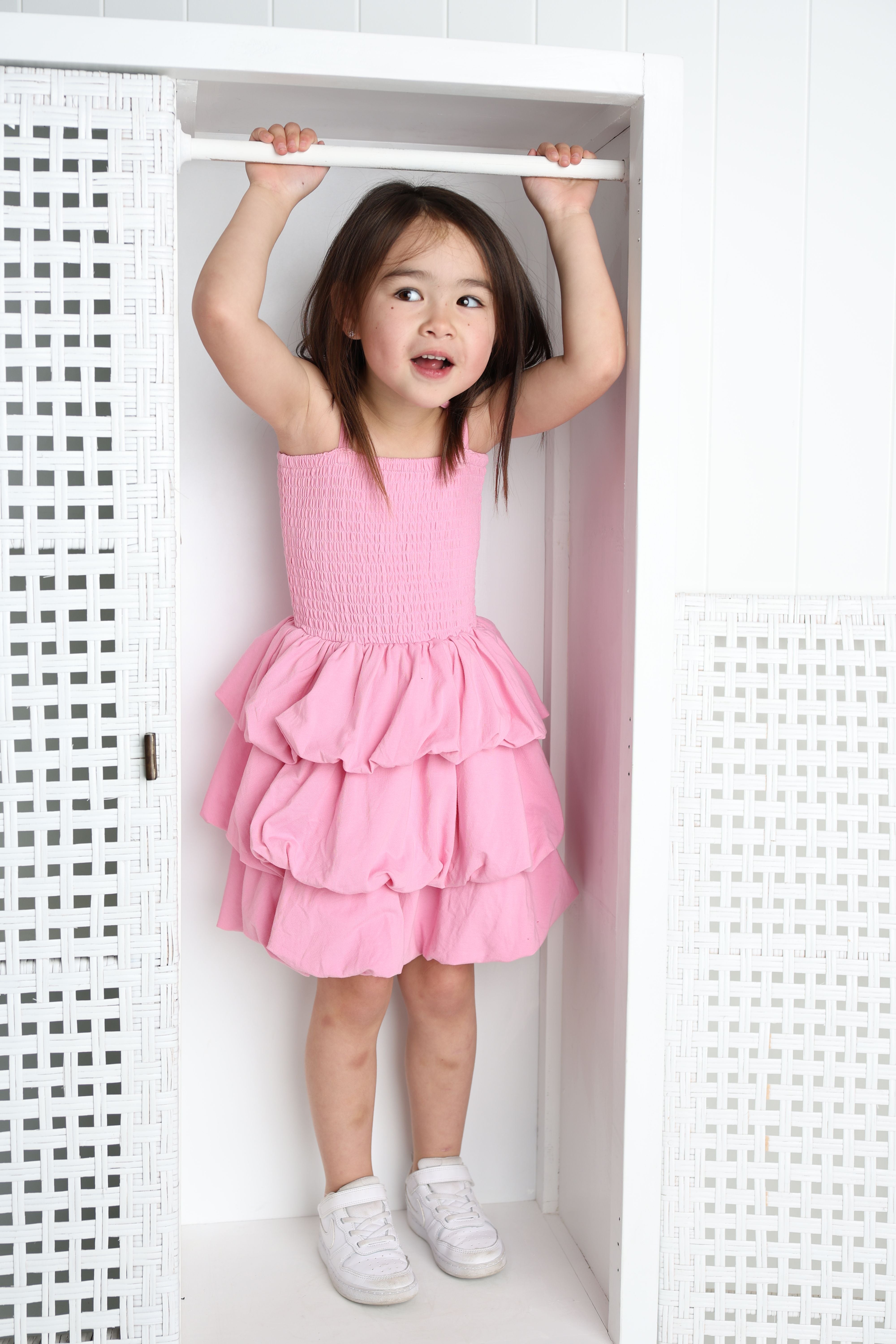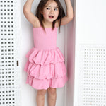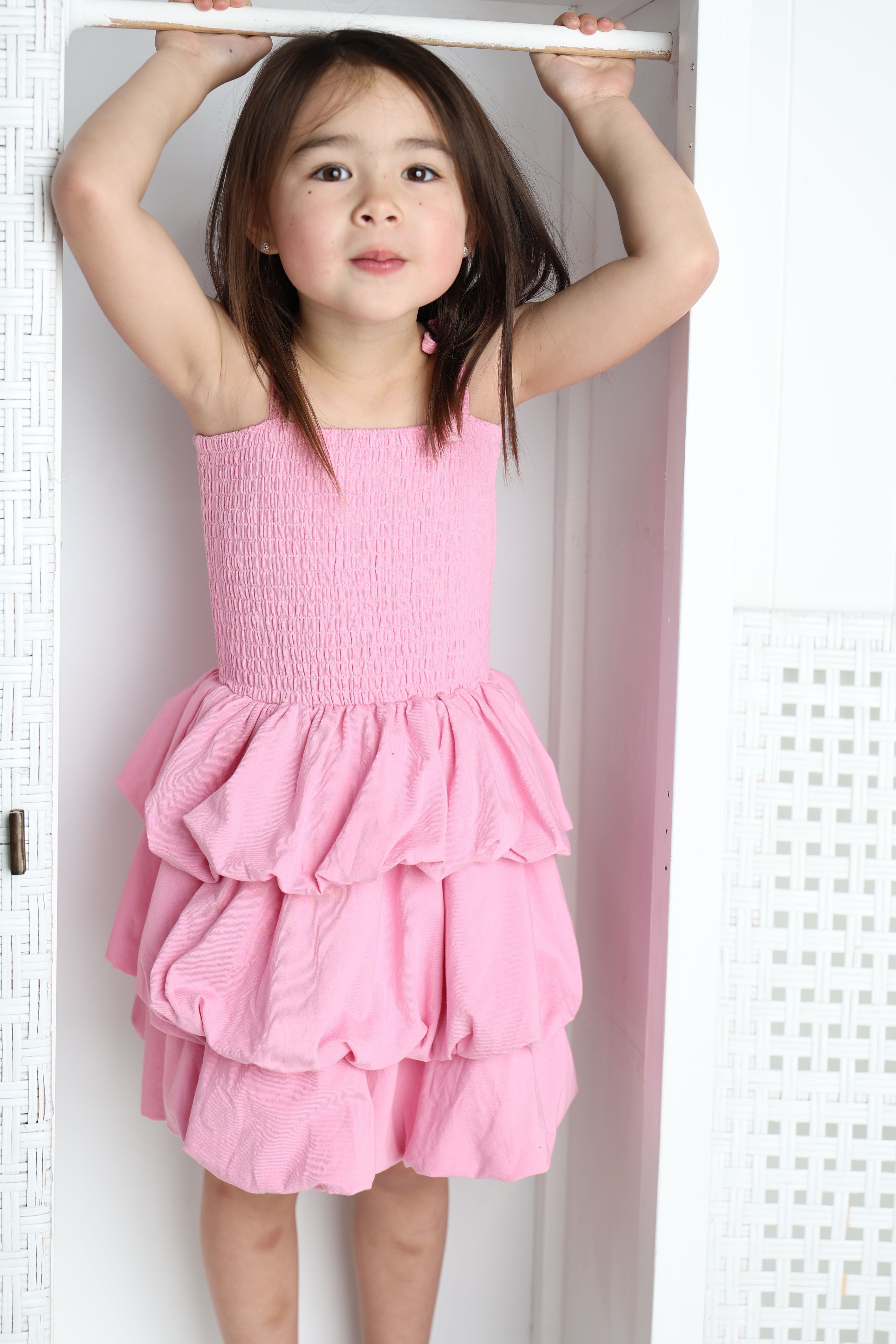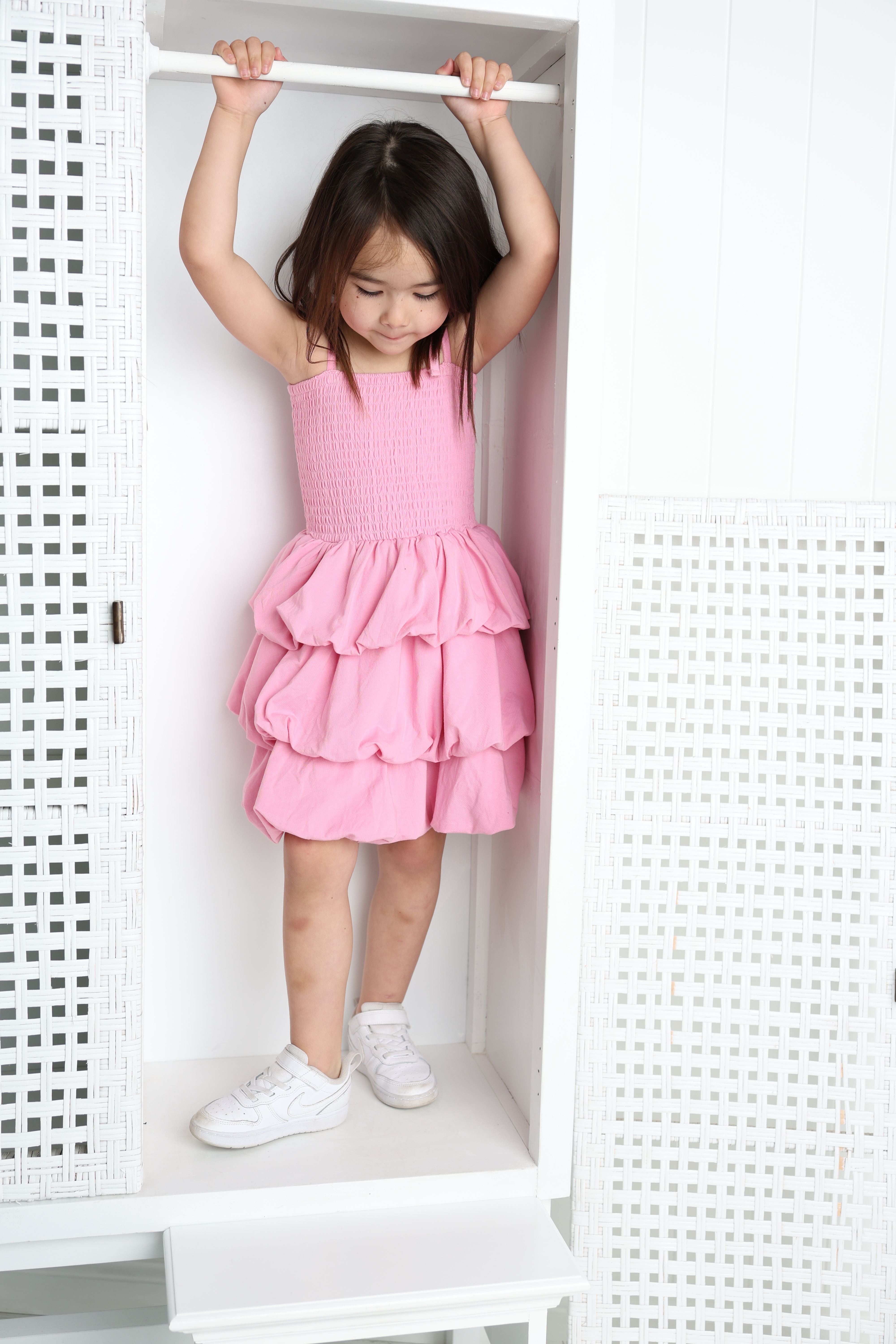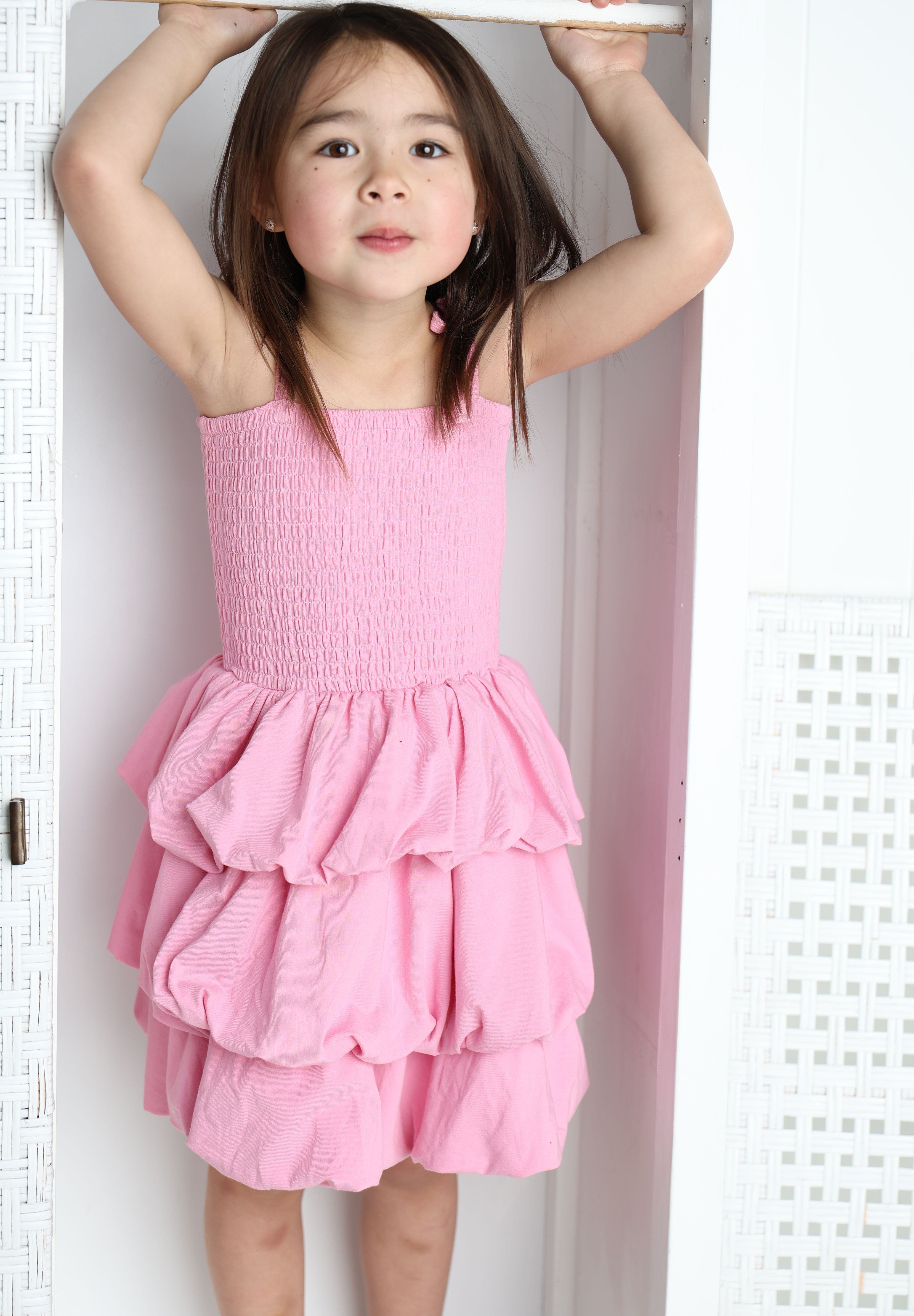Twirl with confidence in this charming bubble skirt dress. The soft pink hue pairs perfectly with the playful ruched detailing that creates dimension and movement with every step. The bubble hem adds a fun silhouette that's ideal for playdates, parties, or everyday adventures. Comfortable and stylish, this dress lets her express her personality while staying cool and carefree.