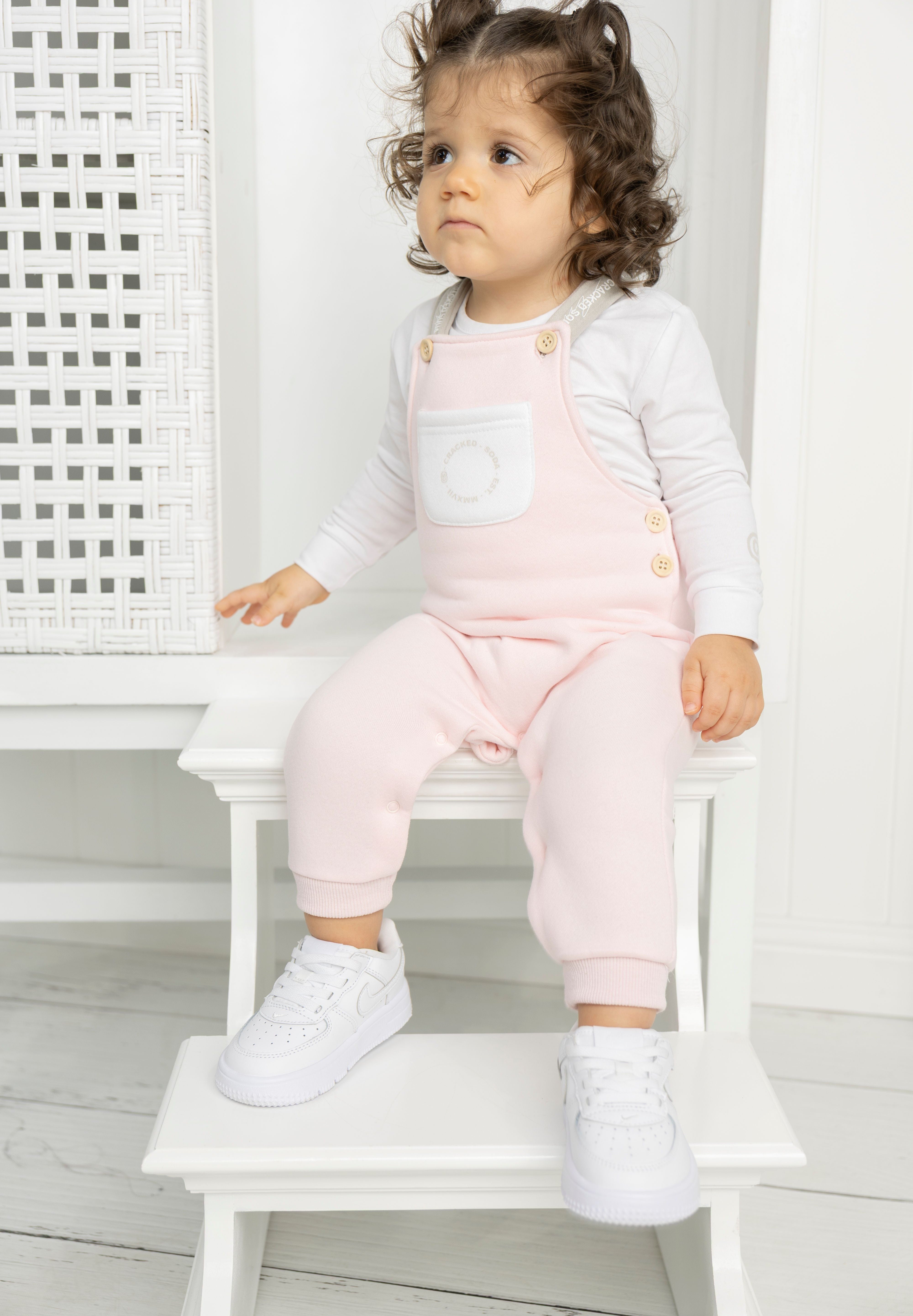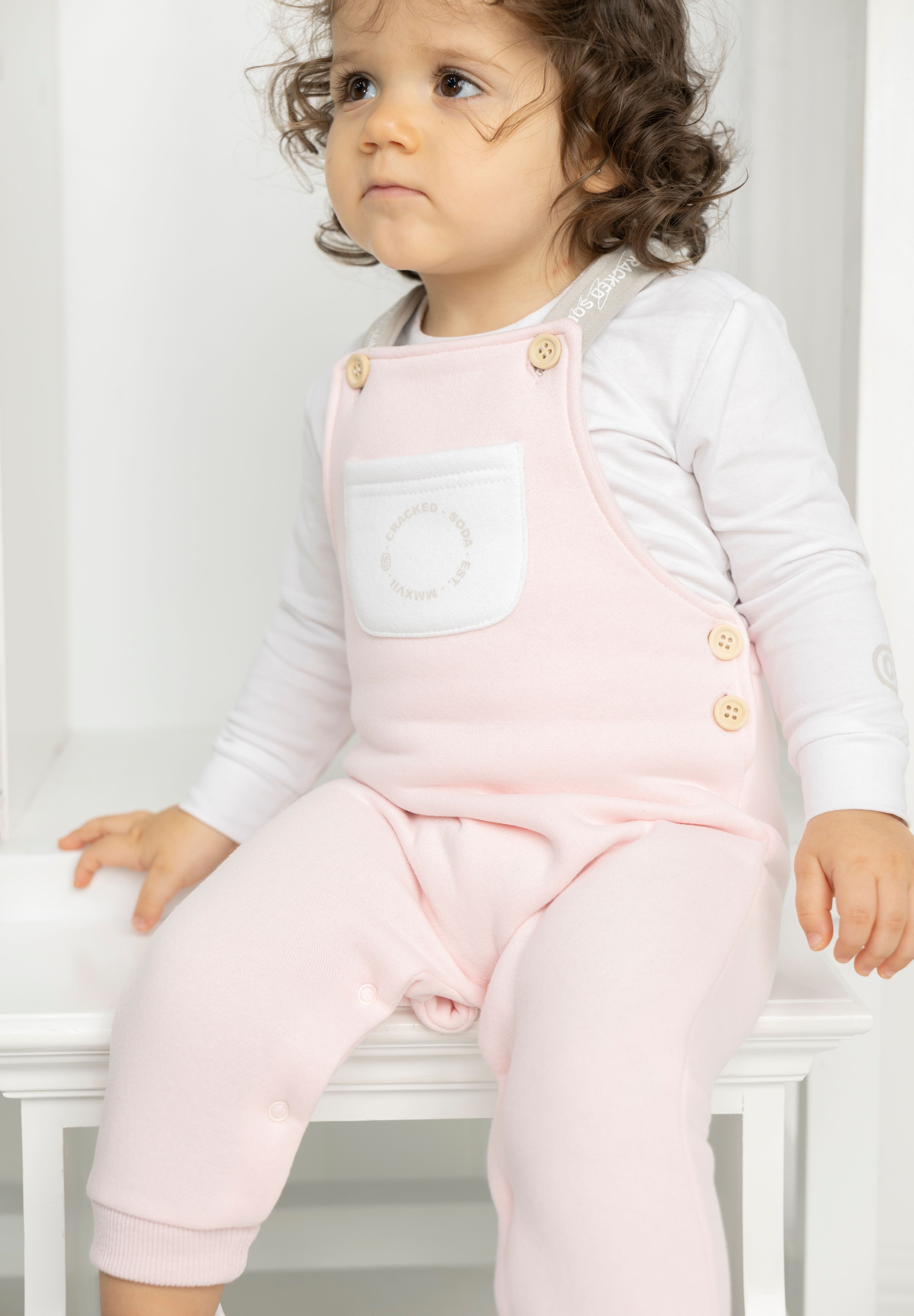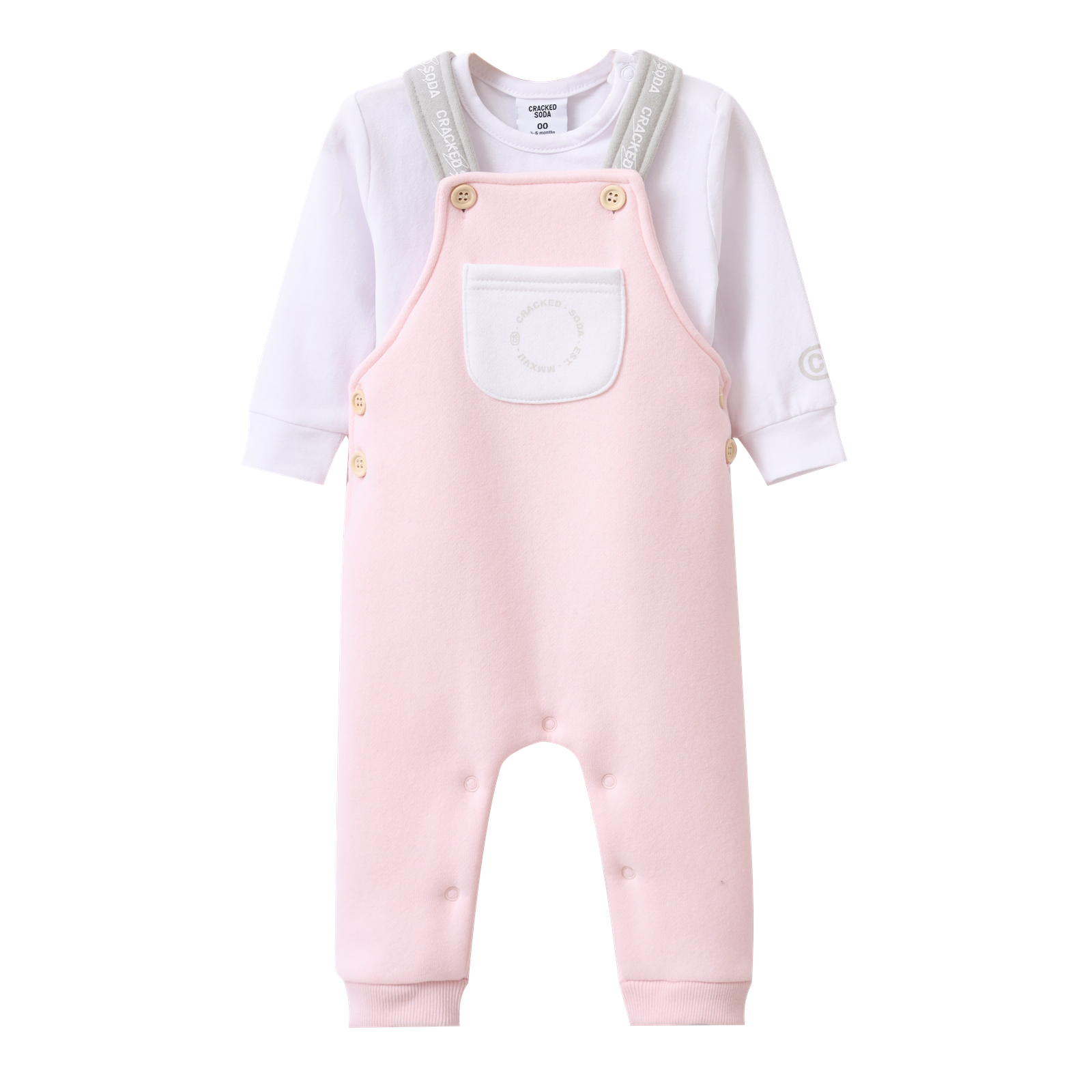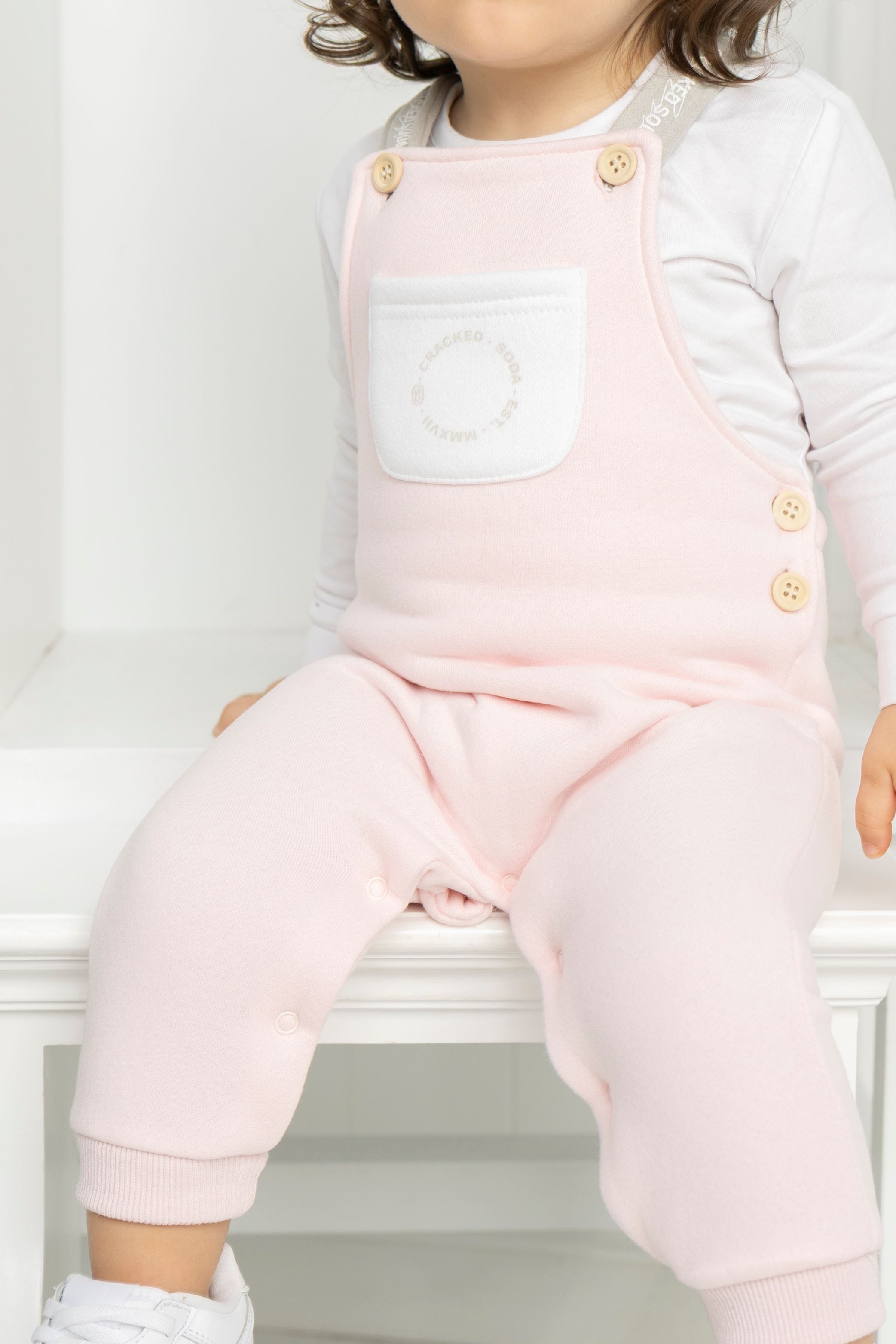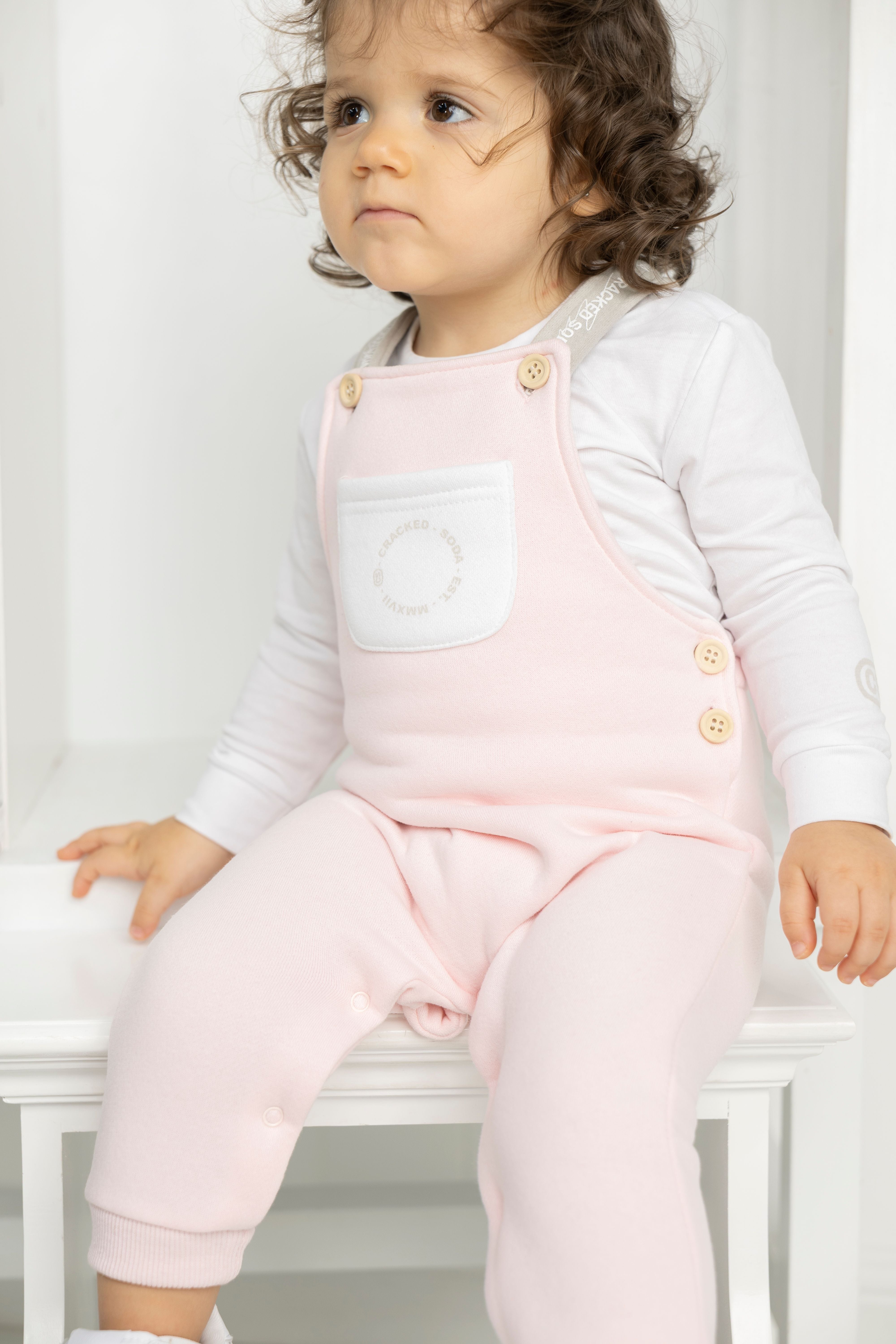 Cosy pink fleece overalls with a contemporary edge. White front pocket features custom detail writing, while light grey adjustable straps with wood button closures add understated sophistication. Includes a crisp white long-sleeve top to wear layered underneath. The combination of soft fleece and refined design details creates a versatile piece perfect for relaxed days with intentional style.