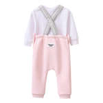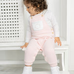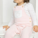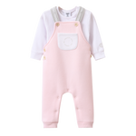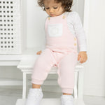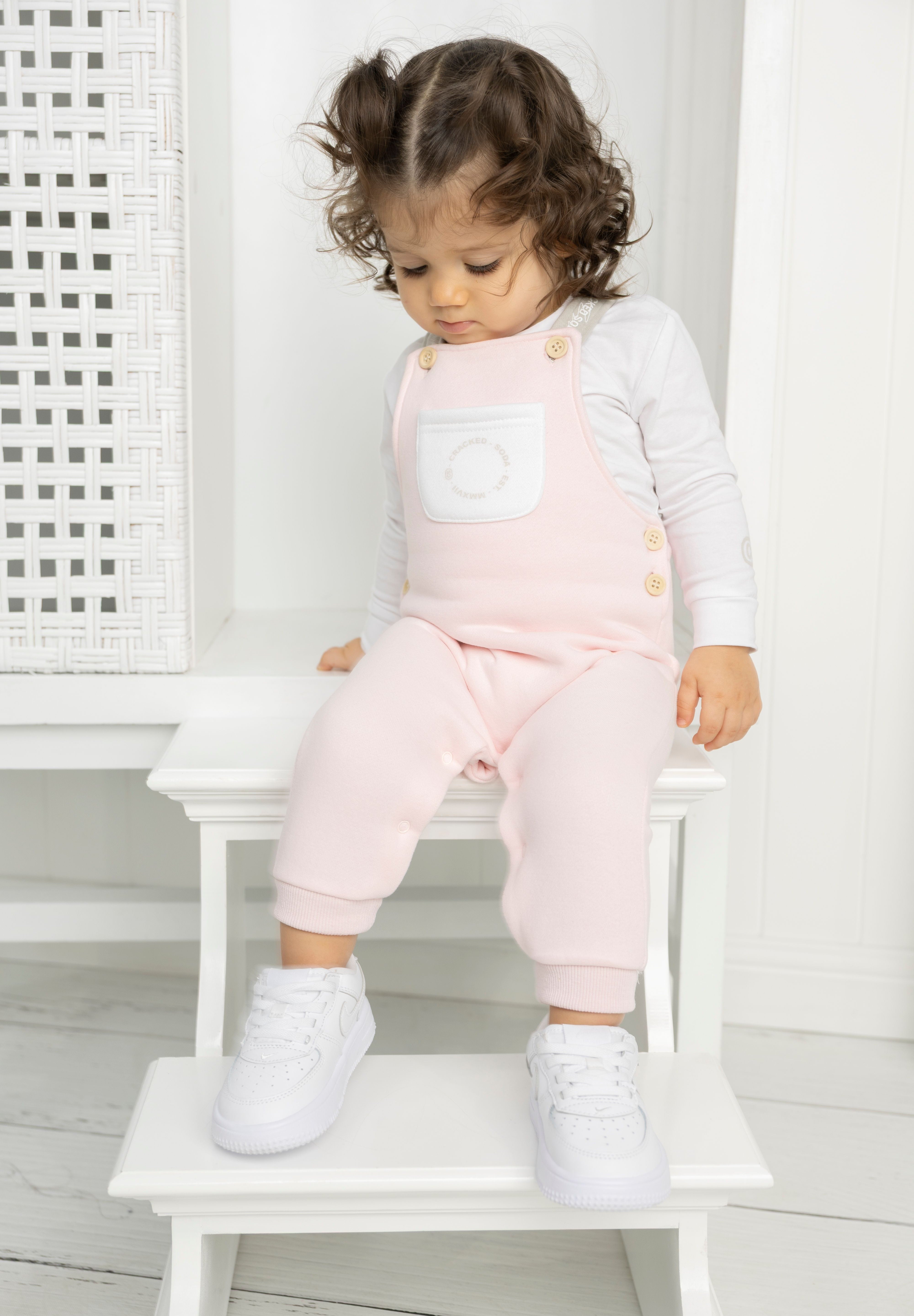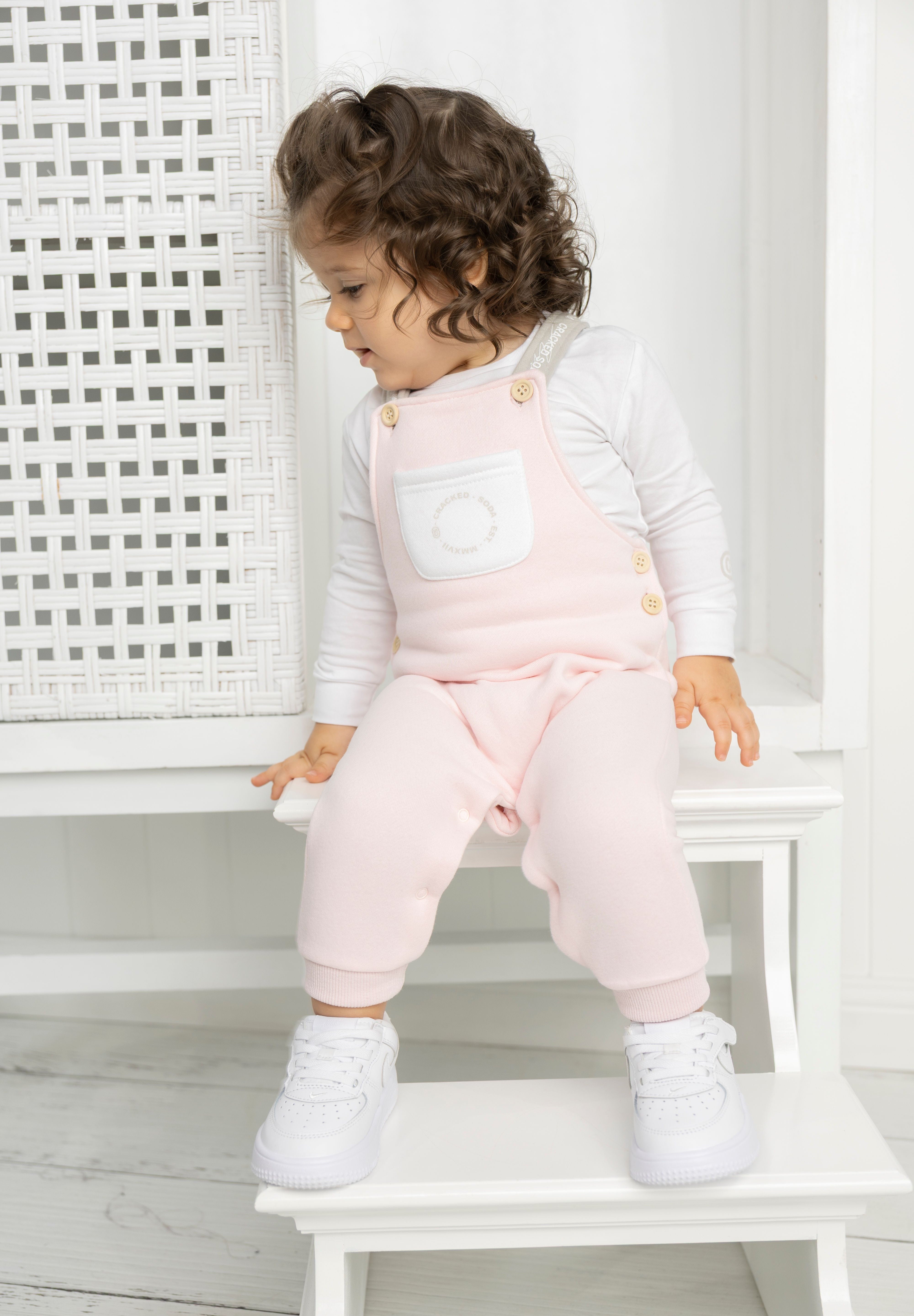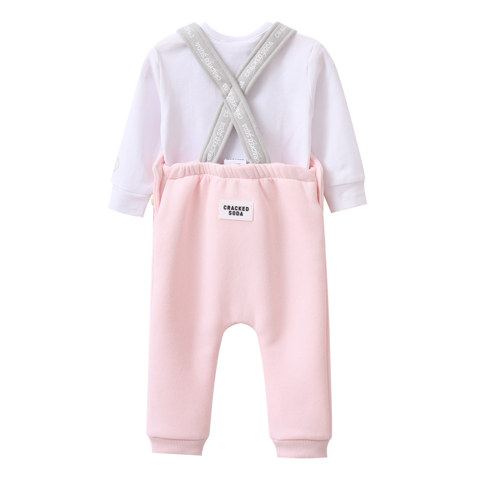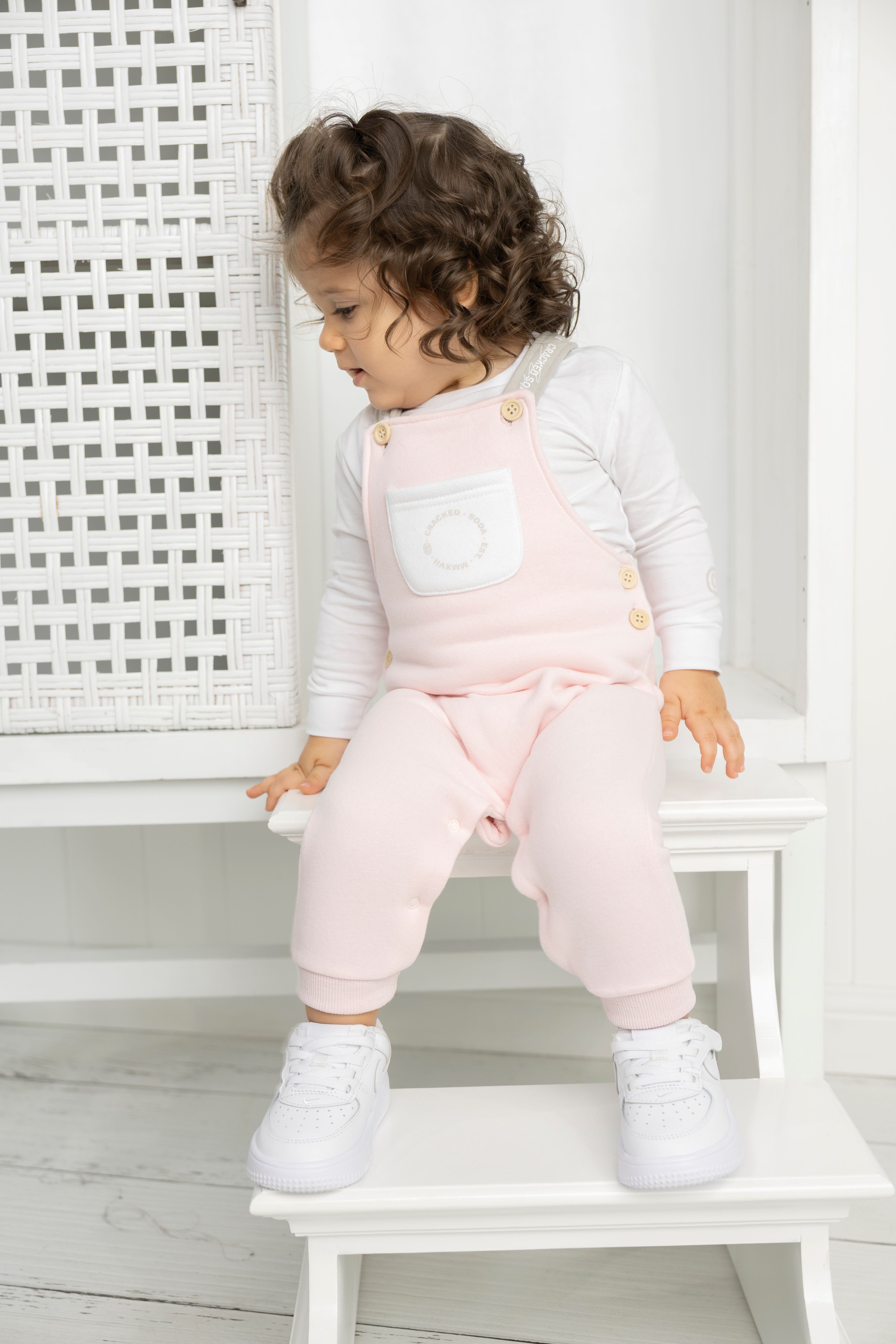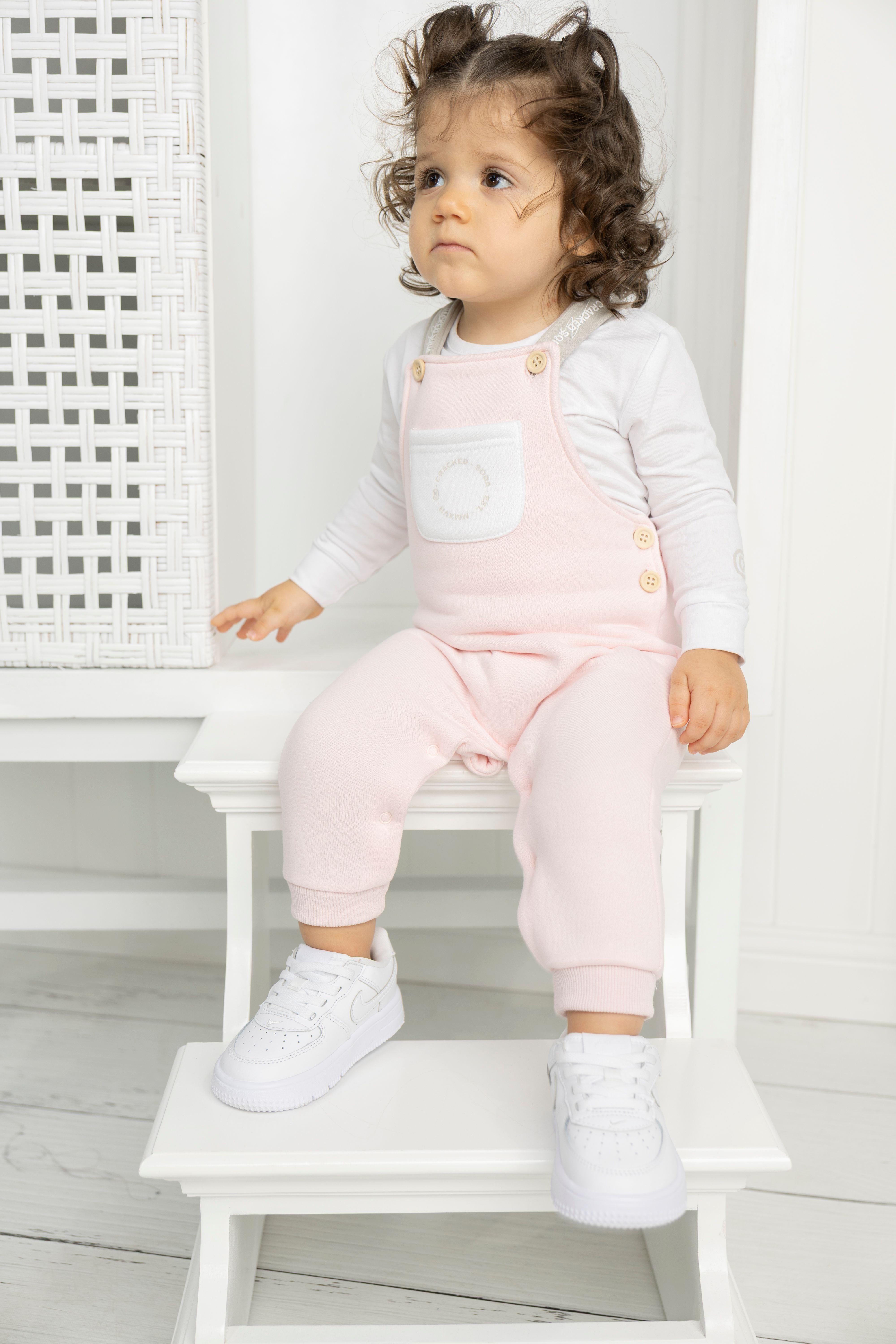 Cosy pink fleece overalls with a contemporary edge. White front pocket features custom detail writing, while light grey adjustable straps with wood button closures add understated sophistication. Includes a crisp white long-sleeve top to wear layered underneath. The combination of soft fleece and refined design details creates a versatile piece perfect for relaxed days with intentional style.