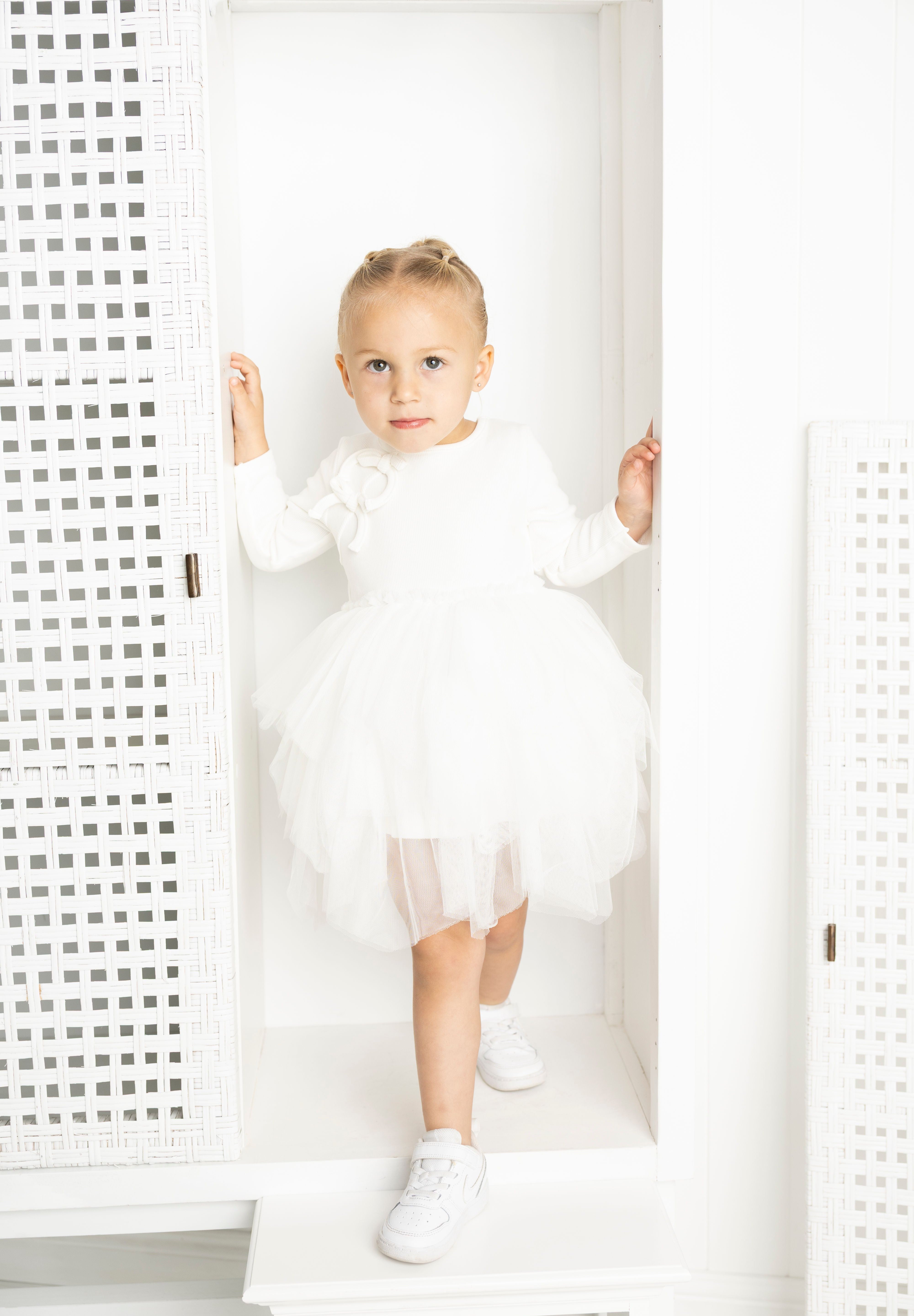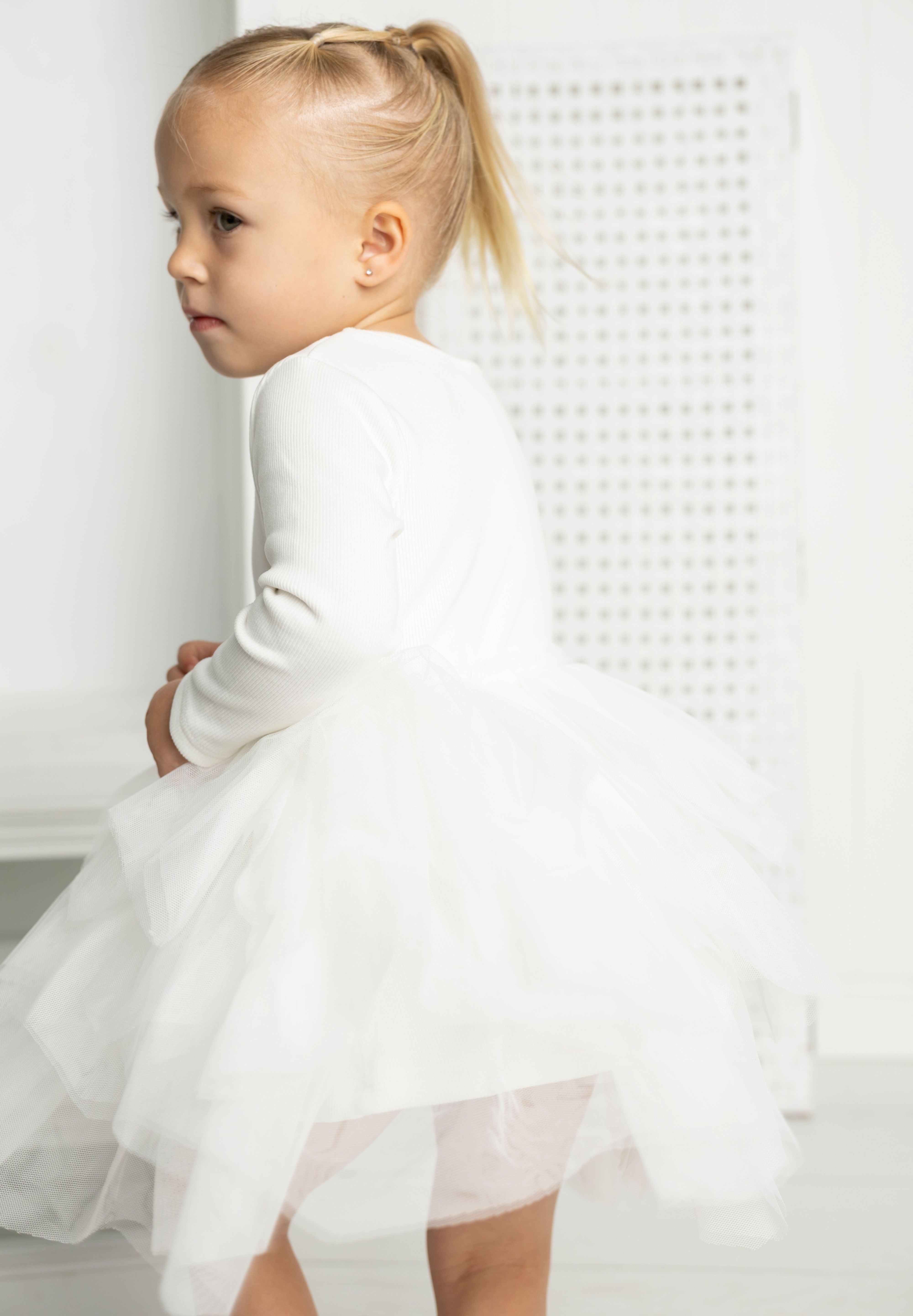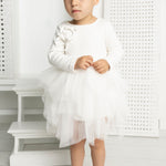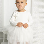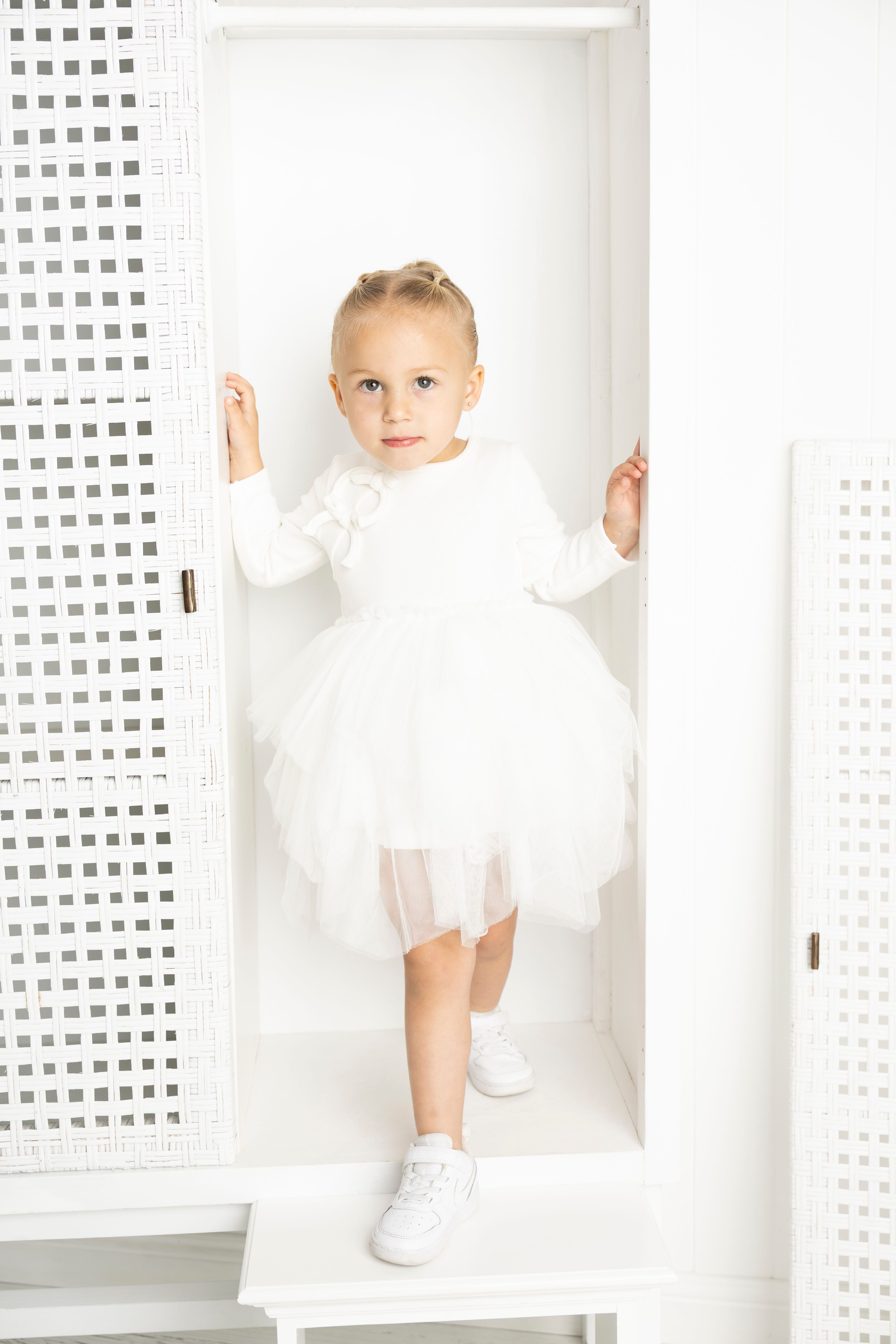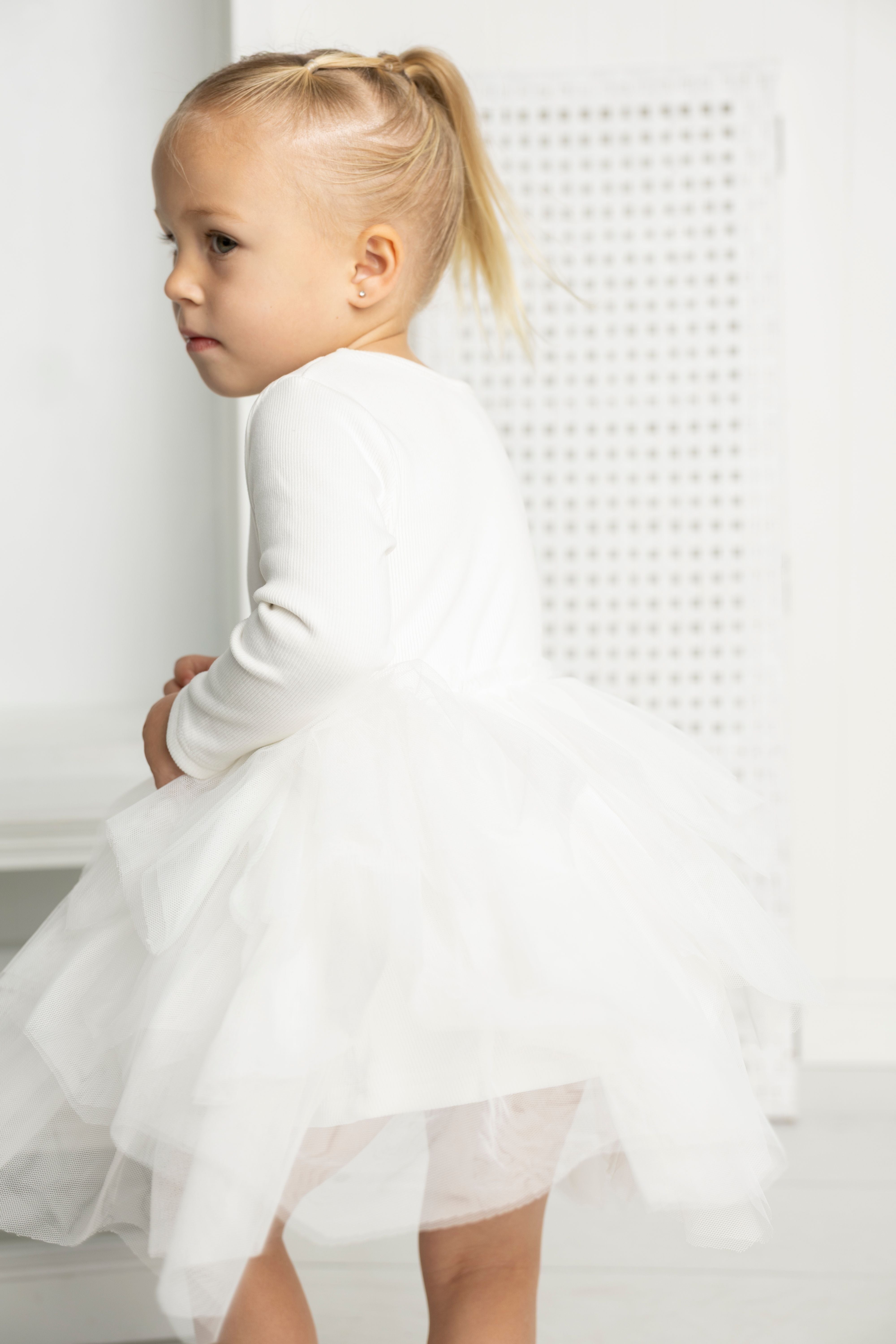 Elegant cream white tutu crafted from soft, flowing tulle! The charming bow detail brings a touch of sophistication to playtime and dress-up adventures. Lightweight and airy, it's comfortable enough for all-day wear while looking absolutely enchanting. Perfect for little ones who dream of dancing, twirling, and making magical memories.